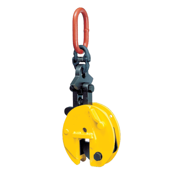 The CX clamp allows for 180° rotation, permitting safe movement from horizontal to vertical lifting and back again. It is also designed to turn vertically racked plates through 90°, thanks to the integrated lifting eye and link system. Its robust construction and ability to handle lateral load forces make it suitable for applications where other vertical clamps may not be appropriate.