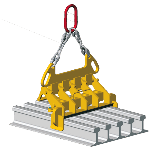 The Camlok® MR Fixed Multi-Rail Grab is engineered to safely and efficiently lift multiple rails at once, making it ideal for rail yards, steel stockholders, and fabrication workshops. Each grab uses swiveling toes that locate under the rail-head and a cam-action top clamp that presses a hard rubber-lined horizontal beam onto the rails, preventing surface marking and damage.