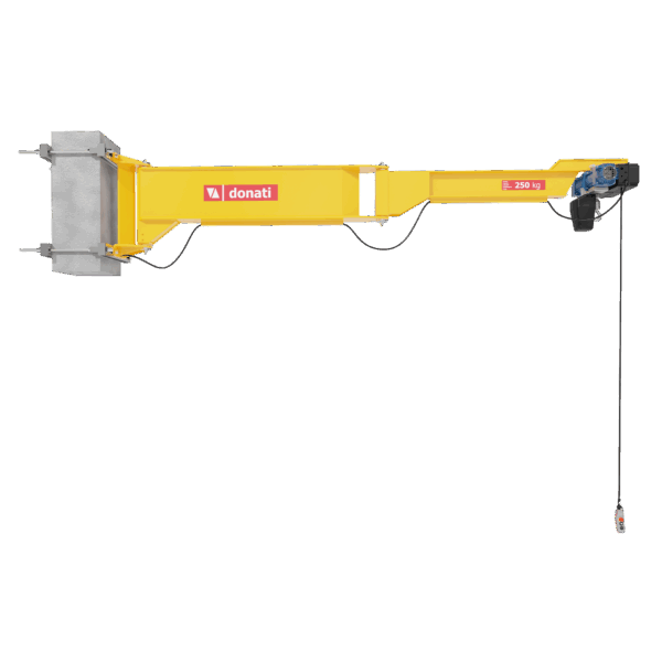 The Donati MBB Wall-Mounted Articulated Jib Crane offers 125–500kg capacity, 3–7m jibs, and 360° rotation. Its hinged arm design avoids obstacles with ease.