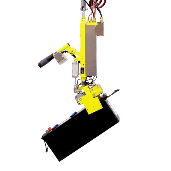 The gripper clamps securely onto both sides of the battery, providing a stable and reliable hold. An integrated sensory plate confirms safe engagement, delivering a near-weightless lifting experience for accurate and controlled handling.