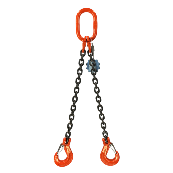Two leg chain slings can be configured with a range of load hooks, including sling hooks with latch, self-locking safety hooks, or C hooks. Optional shortening grab hooks allow the effective length of each leg to be adjusted, making the sling suitable for asymmetric loads or varying lifting geometries.