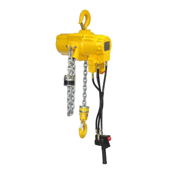 Lifting Capacity: 1.5t � 3t Air Pressure: 4�6 bar Duty Cycle: 100% continuous use Temperature Range: -20�C to +70�C Fail-Safe Disc Brake: Automatically engages when air supply stops Load Limiter: Prevents lifting above 125% of rated capacity Precise Load Control: Smooth and accurate positioning with pneumatic pendant Noise Level: Below 85dB(A) with integrated silencer ATEX Certified: Ex II 3 GD c IIB T4 IIIB T135�C (Zones 2 and 22) Sealed Planetary Gearbox: Heat-treated gears on low-friction bearings Grade 8 Load Chain: Meets EN818-7 Appendix B Optional Accessories: Chain carrier, FRL unit, dual or remote pendant control Complies With: ASME B30.16 and EN14492-2