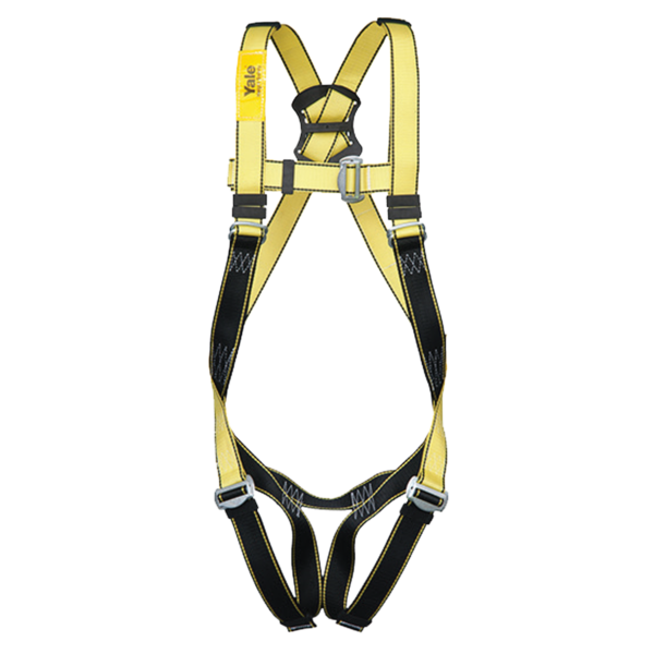 Yale CMHYP10 Single Point Full Body Safety Harness with rear D-ring fall arrest attachment, compliant with BS EN 361. Entry-level height safety harness for general work at height, maintenance and construction use. Features adjustable fit up to 48″ chest size, durable full body design and ISO 9002 manufactured quality. UKCA and CE certified.