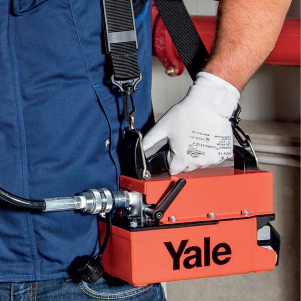 A protective metal cover prevents accidental activation, and a shoulder belt can be attached to the integrated lifting eyes for easy transport. The pump is supplied oil-filled and ready for use, complete with a female hydraulic coupler CFY-1, making it fully compatible with all 700 bar Yale hydraulic systems.